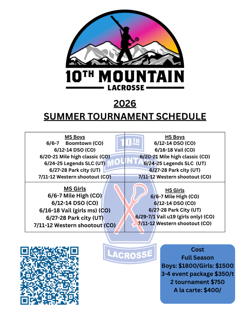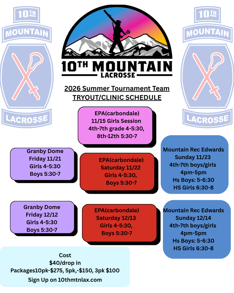 WELCOME TO 10TH MOUNTAIN LACROSSE, WE ARE EXCITED FOR ANOTHER YEAR OF MOUNTAIN CLUB LACROSSE. PLEASE SEE BELOW FOR INFORMATION REGARDING OUR DIVERSE OFFERINGS TROUGHOUT THE YEAR. PLEASE SIGN UP FOR TOURNAMENT TEAMS ASAP. MORE INFORMATION WILL BE POSTED THROUGHOUT THE YEAR AS WE TRANSITION FROM ONE SEASON TO THE NEXT. WE OFFER YEAR ROUND OPPORTUNITIES TO PLAY LACROSSE SO BE SURE TO CHECK OUR PAGES FOR TOURNAMENT TEAMS, CAMPS AND CLINICS!